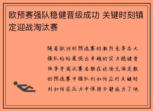 随着欧洲杯预选赛的激烈竞争,各大强队纷纷...